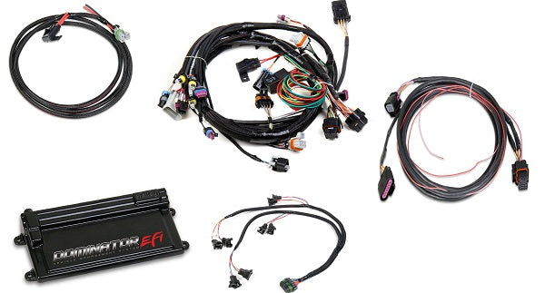 Dominator EFI systems are sold "a la carte". The following must be purchased for a complete system: ECU (includes software and programming cable), Main Power Harness, Wideband Oxygen Sensor, Main Engine Wiring Harness, Injector Wiring Harness, Ignition Adapter Harness and Accessories.